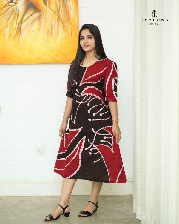 A bold and sophisticated batik dress featuring a striking blend of deep brown and rich crimson red with artistic abstract patterns.