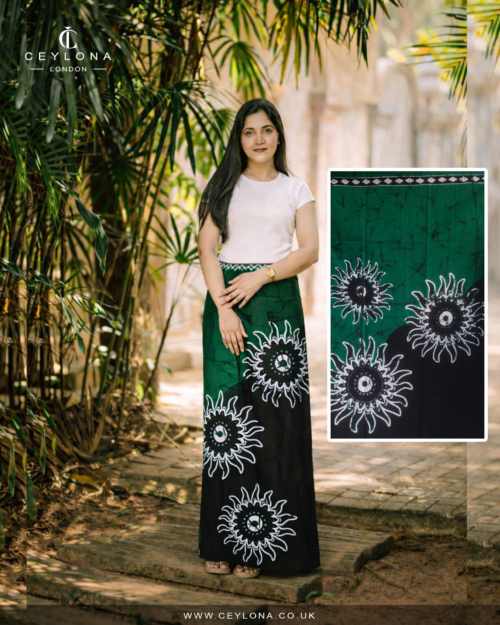 Graceful and symbolic, the Emerald Sun Batik Printed Sarong features a rich emerald green upper tone flowing into deep black, highlighted by a striking white sun-inspired motif. Reflecting strength, harmony, and heritage, this design beautifully blends traditional Sri Lankan artistry with modern elegance.