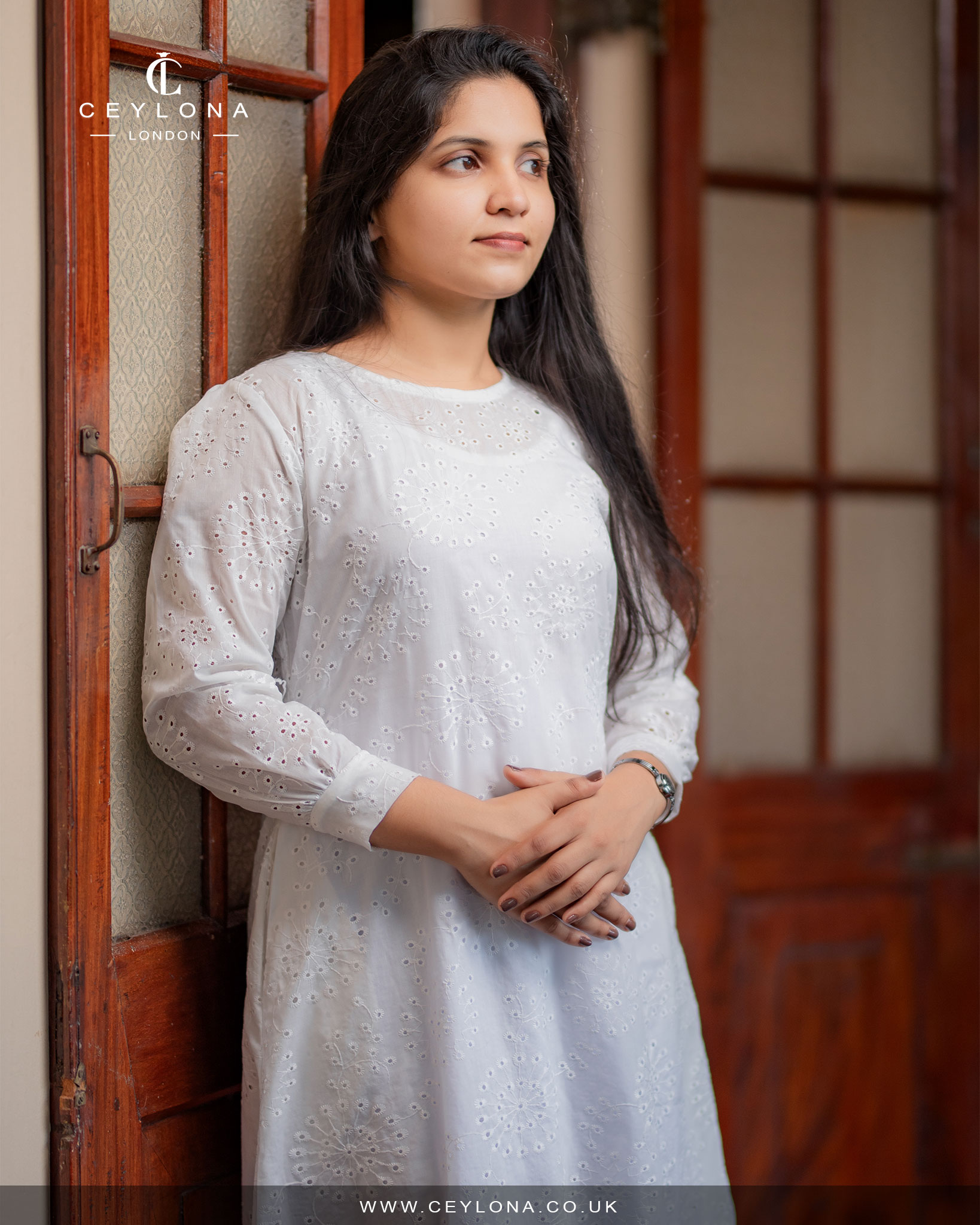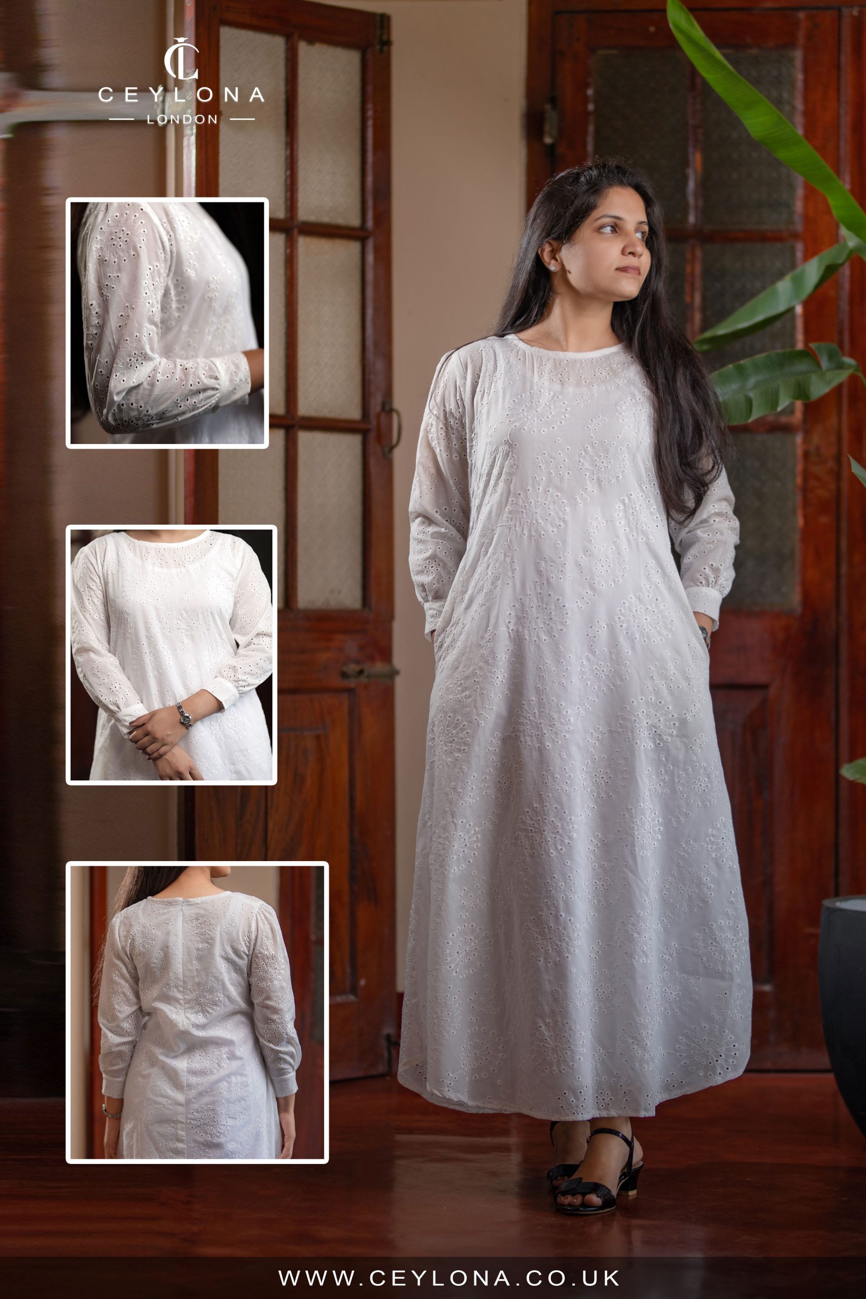 The Heavenly Calm Dress is designed for spiritual celebrations, bringing together modesty and grace. Crafted from light Culton cotton with intricate eyelet embroidery, its flowing silhouette and long sleeves reflect serenity and timeless beauty
