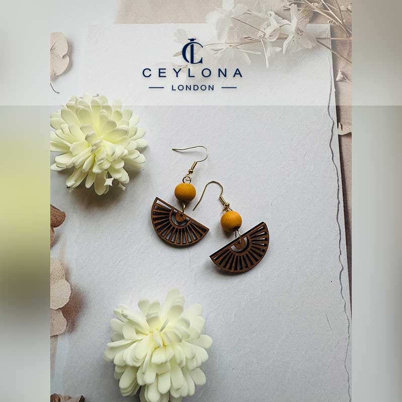 Exquisite wooden earrings with a delicate sunburst filigree design and a warm earthy bead. Inspired by heritage craftsmanship, they blend authenticity with elegance. Lightweight and refined, perfect for both everyday wear and special occasions.