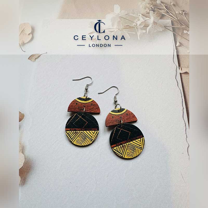 Heritage-inspired earrings featuring warm wood tones, intricate geometric patterns, and earthy hues. With a balanced half-moon and circular design, they embody harmony and elegance. Lightweight and versatile, perfect for a timeless, authentic touch.